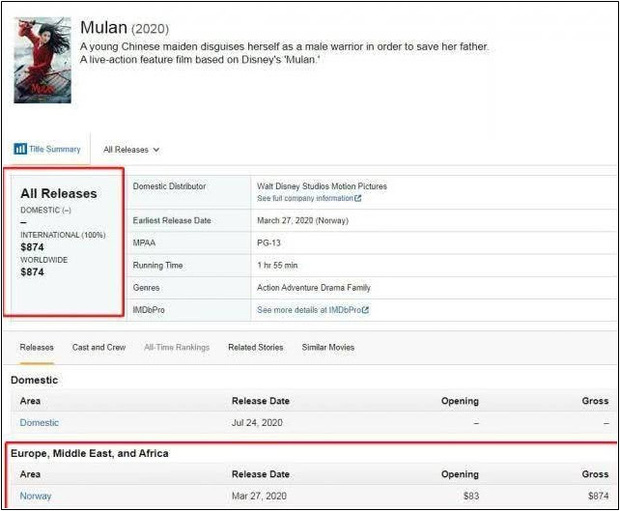 Mới đây, trên trang QQ đã xuất hiện bài đăng thông báo về số phận của tác phẩm Mulan trong suốt gần một tháng qua, khi nó được công chiếu đúng như kế hoạch tại Na Uy vào ngày 27/3. Theo đó, bộ phim Disney do Lưu Diệc Phi đóng chính đã… thất bại thảm hại ngay ngày đầu trình làng. Cụ thể, các phòng vé ở Na Uy chỉ thu về 83 USD, tính theo giá tiền Trung Quốc là khoảng 600 NDT (xấp xỉ 2 triệu VND) trong ngày đầu tiên.